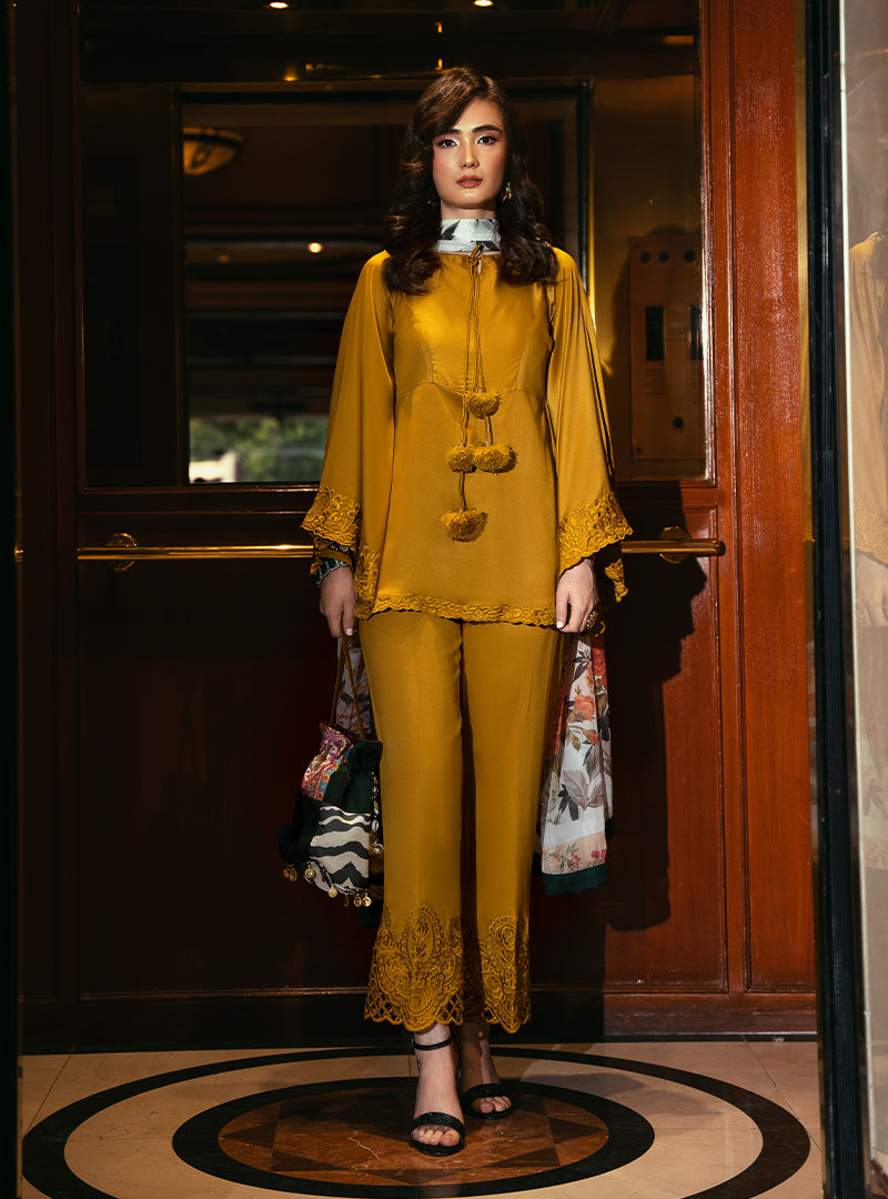 Detail: Step into understated luxury with this silk set. The sleek shirt and trousers create a refined silhouette, while the airy chiffon dupatta adds a soft, graceful touch to complete the look. Machine embroidery details added to the bell sleeves and trouser with cut work . Perfect for timeless elegance with modern flair.