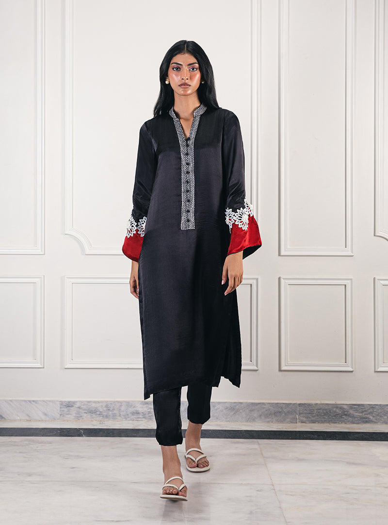 Two Piece Bangali Silk Shirt Elevate your power dressing with Mahnoor Dochki's meticulously crafted women's suits. Designed in Pakistan, these timeless pieces are made from high-quality fabrics to flatter every body type and exude sophistication. Perfect for the modern woman who demands both style and comfort.