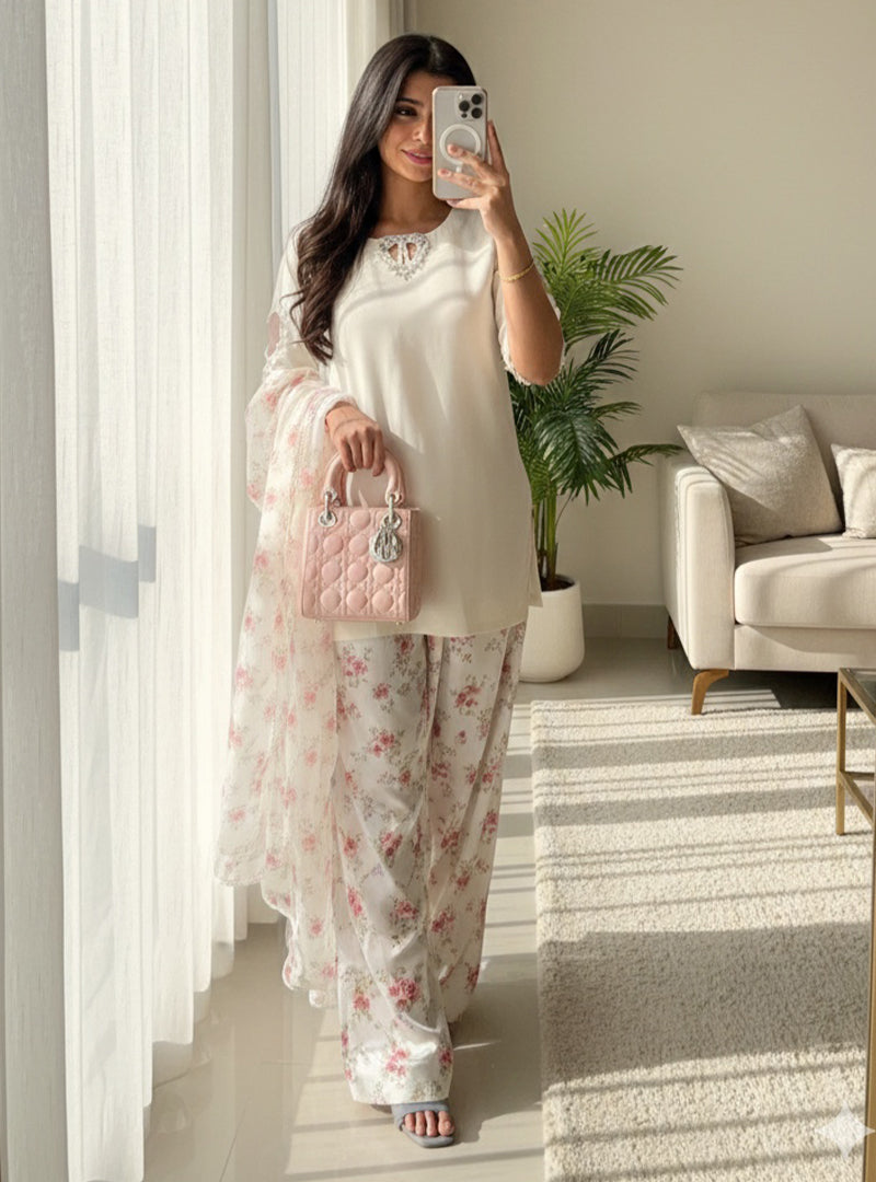 3 Piece Suit (Pure cotton net shirt, Silk shalwar tissue silk dupatta with hand worked button)
