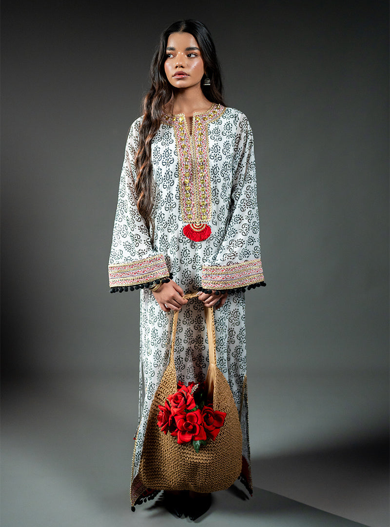 Fabrics: Georgette tissue with cotton silk lining Details: Elevate your wardrobe with our exclusive 2-piece ensemble. Featuring original prints, handcrafted gotta detailing, and lavish gold coin accents, it exudes luxury and charm with a touch of bohemain flair. The freestyle cut and artisanal handmade tassels add a bespoke touch, perfect for those who appreciate refined elegance and impeccable craftmanship. Elevate your power dressing with Mahnoor Dochki's meticulously crafted women's suits. Designed in Pakistan, these timeless pieces are made from high-quality fabrics to flatter every body type and exude sophistication. Perfect for the modern woman who demands both style and comfort.