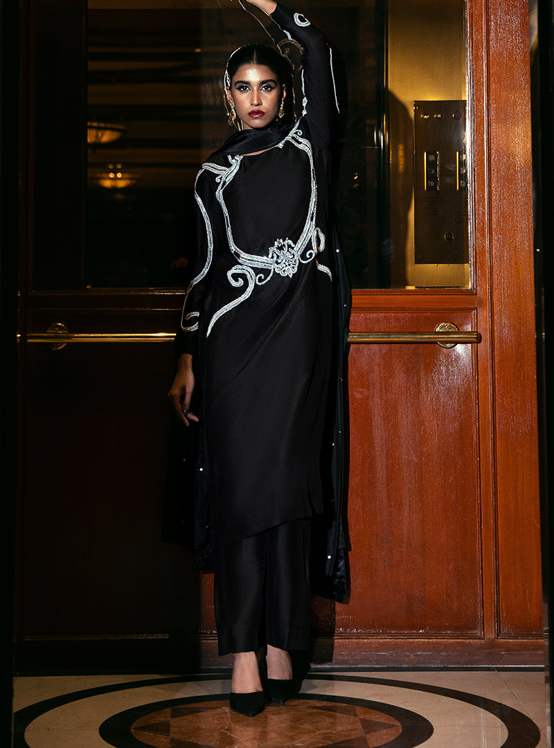 Detail: Embody grace in this pure raw silk outfit, where the rich fabric of the shirt and trouse is elevated by a delicate pure silk dupatta. The combination of luxe fabric brings both simplicity and elegance to your look. Swarovski added on the body of the garment to stand out