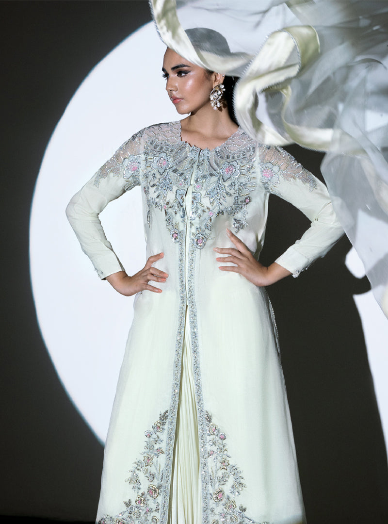 Detail: This exquisite ivory ensemble exudes elegance, featuring intricate silver embroidery with pink zardosi flower accents across the bodice and shoulders, adding a touch of delicate sophistication. The long, flowing shirt opens to reveal wide-leg trousers crafted from crushed fabric, bringing a modern edge to the traditional silhouette. The sheer organza dupatta, adorned with handmade flower tassels, completes the look, enhancing its graceful charm. Perfect for those who appreciate fine craftsmanship and a timeless blend of classic beauty with contemporary style.