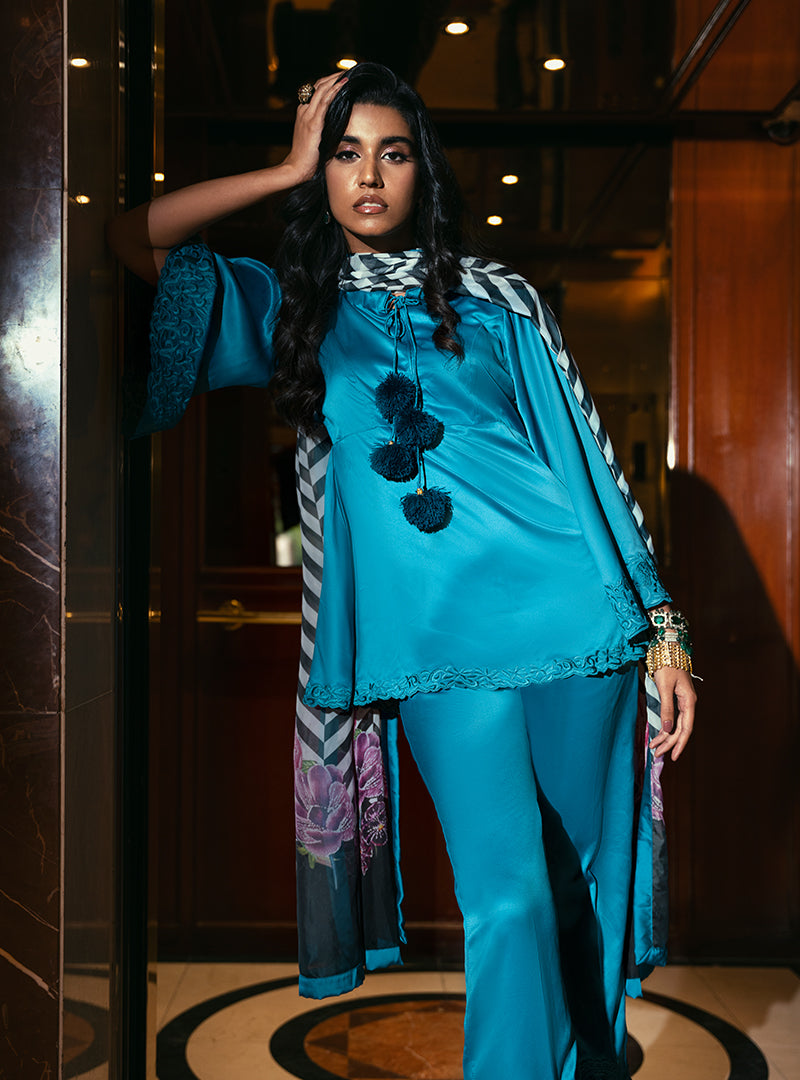 Detail: Step into understated luxury with this silk set. The sleek shirt and trousers create a refined silhouette, while the airy chiffon dupatta adds a soft, graceful touch to complete the look. Machine embroidery details added to the bell sleeves and trouser with cut work . Perfect for timeless elegance with modern flair.