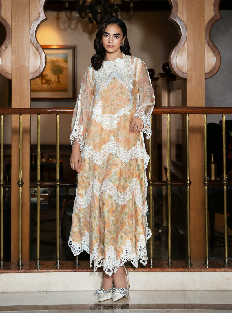 Detail: Embody grace in this pure cotton net sunflower kaftan, where the rich lace of the Kaftan is elevated by a delicate tissue silk dupatta. The combination of luxe textures brings both simplicity and elegance to your look.